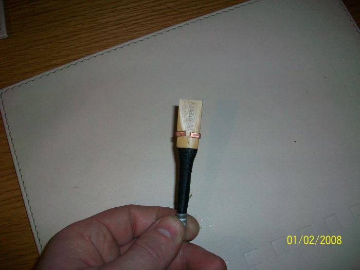 A reed of this style will require a "heavyish" scrape as can be seen from the photo, take care when doing this and pay particular attention to the pitch and stability of the back D. The back D in this reed is designed to play slighly sharp of the rest of the chanter. There are reasons for this, a small piece of tape over the hole will rectify this.