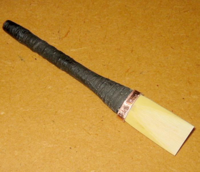 3 3/8" The A on this chanter is extremely flat. The only way I could get most of the notes in tune is by adding cork to the back D hole and the B hole, and inserting a thick rush up to the A hole. Cardboard tube is added to the bell end to lower the bottom D.
